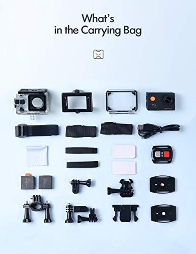 - Longer Battery Life & Free Mounting Accessories: action video cameras 4k comes with 2 rechargeable 1050mAh batteries, remote control wristband and 18 accessories kit, each battery can record up to 90 minutes. The accessories kits are available for most kinds of camera even AKASO, GoPro.