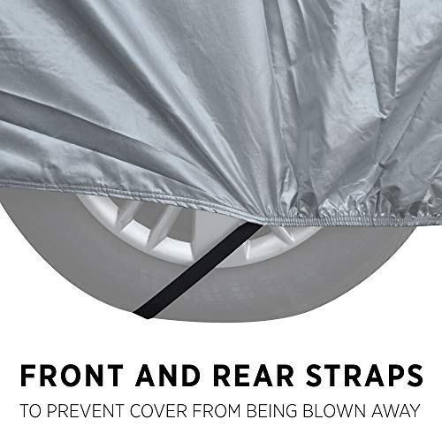 - 【Upgraded Windproof Design】After optimizing and upgrading, we design five straps to make the car cover stay in place- four straps tied on four wheels, and one strap passed through the middle of the car; and combine the elastic hem on the bottom fixing on the car, the performance of windproof and durability is better than other similar 6 layers products that only have easily broken plastic buckle fixed in the front and rear.
