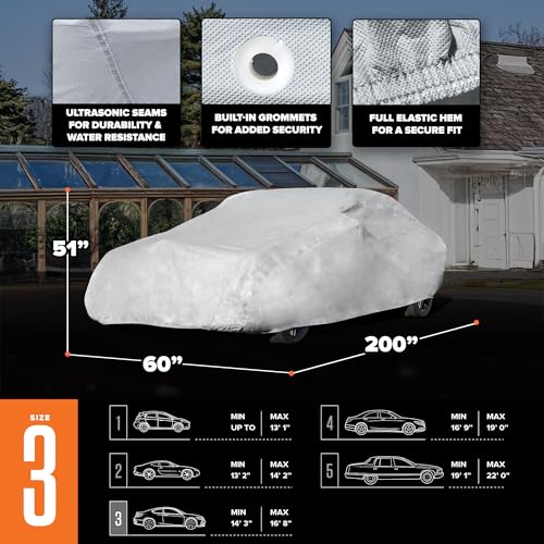 - FITS FULL-SIZE VEHICLES: A full elastic hem and built-in grommets ensure a snug, reliable fit; sized at 200" L x 60" W x 51" H for full-size cars