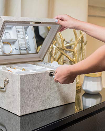 - LOCKABLE jewelry box features a large divided drawer, sections for rings, earrings and necklaces, storage for bracelets and watches