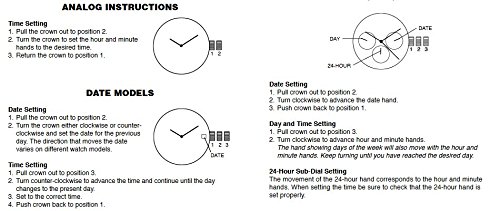 - Movement: Quartz movement with chronograph analog display and date window; three subdials to track minutes, seconds, and 24-hour time; stopwatch functionality; imported