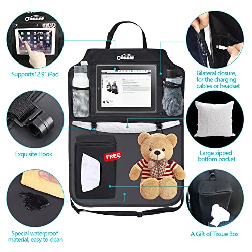 - 3 Car Organizers and Storage: Oasser Car Seat Back Protectors has Mesh bags at both sides to store drinks, power bank etc; zipped bottom pocket, which you can store books, magazines, snacks and etc; 2 plastic hooks to hang things like umbrellas and the tissue box (an additional gift)