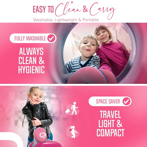 - EASY TO CARRY AND KEEP CLEAN- Fully machine washable, soft and flexible, very lightweight, and comes with a carry case to keep it clean. The snap loop in the back of the pillow makes it easy to clip it to the kids' backpack, suitcase, and car seat.