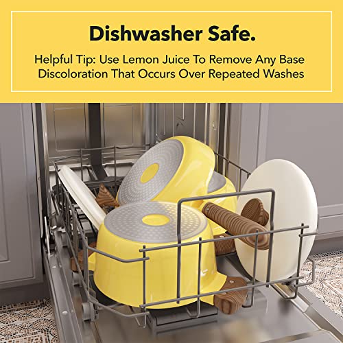 - Premium pots and pans set comes in modern green, blue or yellow color with white accents to brighten your home or apartment kitchen. Clean the cookware set in the dishwasher or hand wash with soap and always keep the cookware dry after cleaning. Discoloration may occur on the bottom of the pans after long term use or repeat washing.