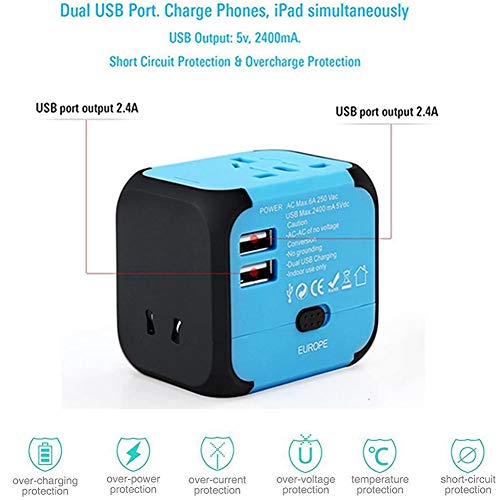 - [SAFETY GUARANTEE DESIGN]: The travel power adapter has safety shutter and contains internal safety protection mechanisms, including overload dual fuse, overload surge protection, over temperature protection, plug lock system, short circuit protection, over-current protection and etc. Usually, a hidden blue led power indicator will flash when you charging your device successfully, the replacement fuse can give you solution in case of emergency.