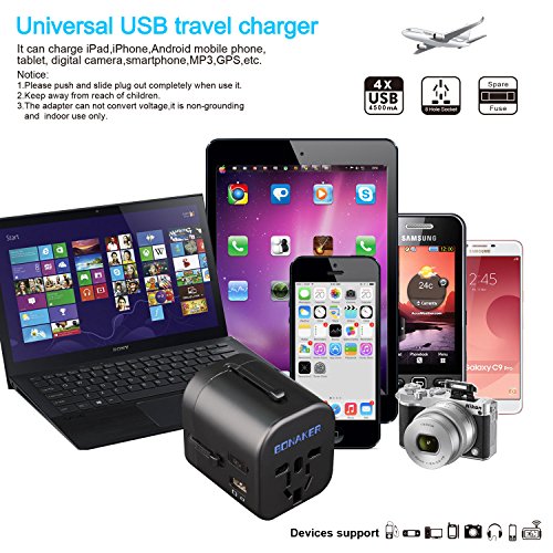 - ➤Smart Charging:International power adapter allow 4 USB devices and prong plug outlets grounded or ungrounded devices charging at the same time. It can charge iPad,iPhone,Android mobile phone,tablet, digital camera, smartphone,MP3,GPS, Laptop, MAC,etc. Can share multiple ports with friends or family at home,office,traveling.