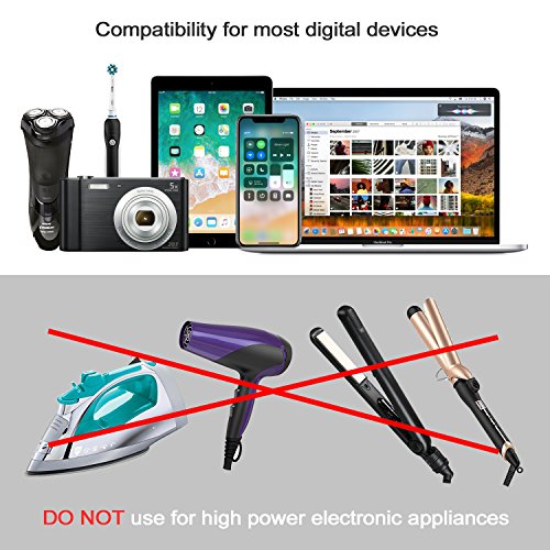 - [WIDE COMPATIBILITY]: The travel charger includes 5 different input plugs tightly embedded in one adapter, but can satisfy what you need. It can recognize any electric appliances device and maximize the charging efficiency, such as iphone, ipad, laptop, curling iron, hair dryer and small fans. (notice: The max power is 1840w.)