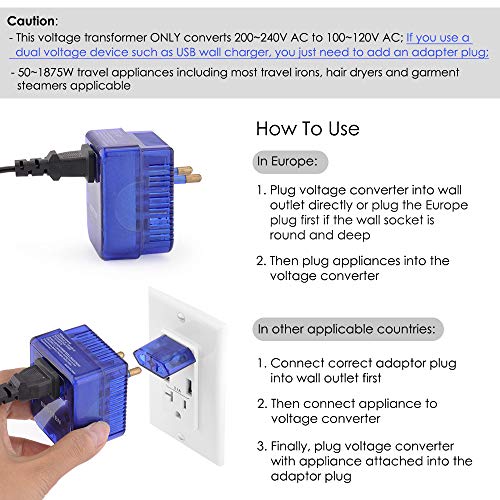 - ElecLead 2000W World Travel Adapter and Converter COMBO to Step Down the voltage from 220v to 110v and ensure safe operation of your ELECTRIC APPLIANCES. Examples are hair dryer, steam Iron, electric kettle, mixer or small fans.