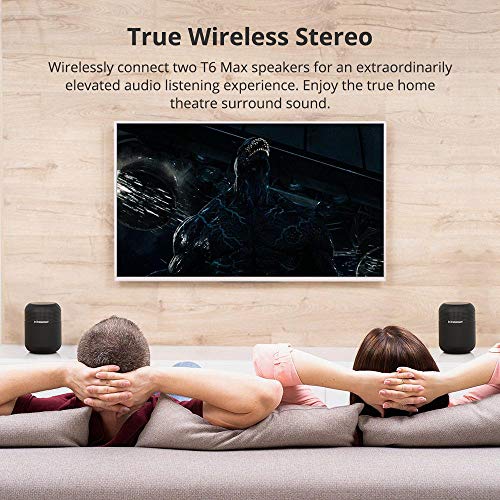 - Truly wireless stereo sound:Wirelessly connect two T6 Max powerful speakers for an extraordinarily audio experience. With the latest Bluetooth 5.0, T6 Max delivers stable and faster connectivity with enhanced range up to 33ft resulting in a true home theatre experience, great to watch movie, TV series and play games on mobile devices like smartphone and tablet.