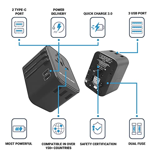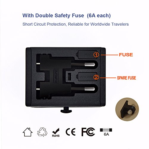 - 【Safety&Certified】This travel adapter qualified with FCC, CE and RoHS certified safety system with safety 6.3 Amp fuse, ensure complete protection for you and your devices. Built-in safey shutters protect users from the direct touch of the live parts on the socket outlet.Only one plug-type can be used at one time, other plug-pins are locked automatically.