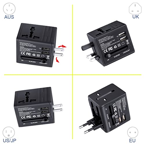 - Universal Travel Adapter: This universal power adapter with different prongs, fits with USA/EU/UK/AUS outlets. It covers more than 160 countries with 100-240V input, but not for South Africa