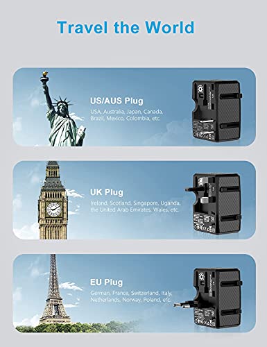 - 【International Travel Adapter】 This travel adapter Built to be the must have travel accessory for your worldwide travelling in UK, Ireland, Scotland, Australia, USA, Canada, South America, parts of Africa, Middle East, Asia, China, Japan, most European countries such as Austria, Belarus, Belgium, Croatia, Denmark, Finland, Germany, Greece, Hungary, Portugal, Poland, Netherlands, Spain, Turkey, Iceland, and Italy etc. Over 150 listed countries can be checked in description.