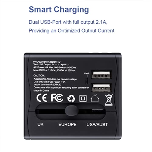 - SAFETY PROTECTION - One of the very few all-in-one travel adapters that pass the very strict regulatory standard BS:8546.Certified by FCC, CE, ICE, and ROHS, high-quality fire-resistant and high temperature-resistant PC material make it fireproof of up to 750℃. Two 8A fuses included, Built-in Safety Shutters, Smart IC for intelligent charging and an LED power indicator. If steady LED means it's in normal operation; LED flashing means it is overload.