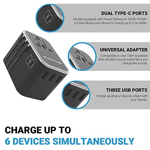 - *ALL IN ONE INTERNATIONAL TRAVEL ADAPTER: 4 USB + 1 Type C large 5.6A fast charging, smart IC smart charging, intelligent matching used digital products, providing charging output. Type-C charging supports the charging of Iphone, IPad, Samsung Tab, Smartphones, Tablets, Bluetooth Speakers & Headset etc