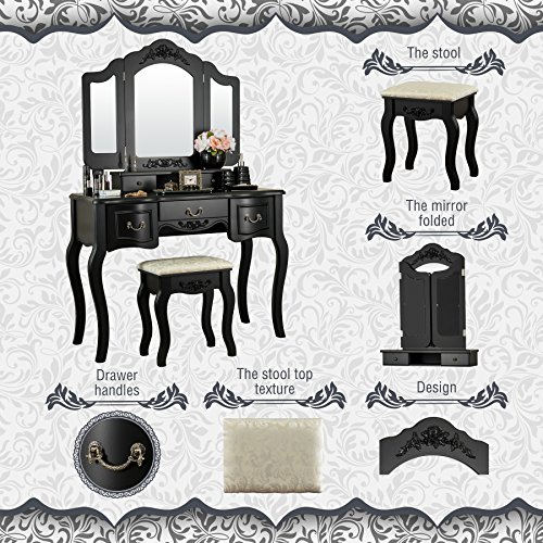 Fineboard CFB-VT04-BK Vanity Beauty Station Makeup Table and Wooden Stool 3 Mirrors...